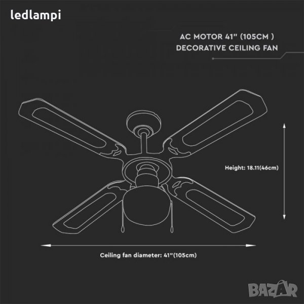 Вентилатор за таван 60W с лампа 1хЕ27 4перки 105cm