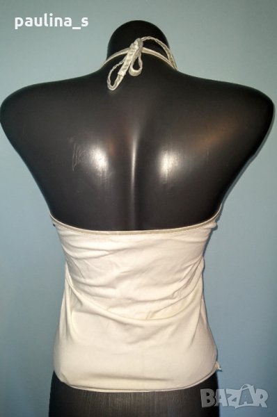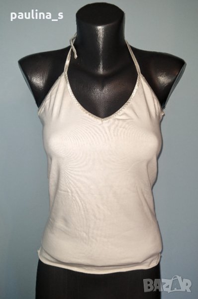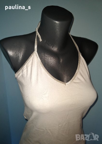 Еластичен потник с гол гръб и сатенена декорация. Материята е памук и ликра, доста еластична и покрива няколко размера. Долу е без оверлог.
