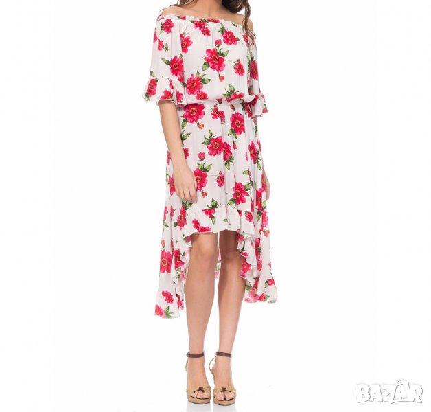 Асиметрична лятна бяла рокля с червени цветя марка Lady Boho - L