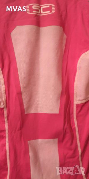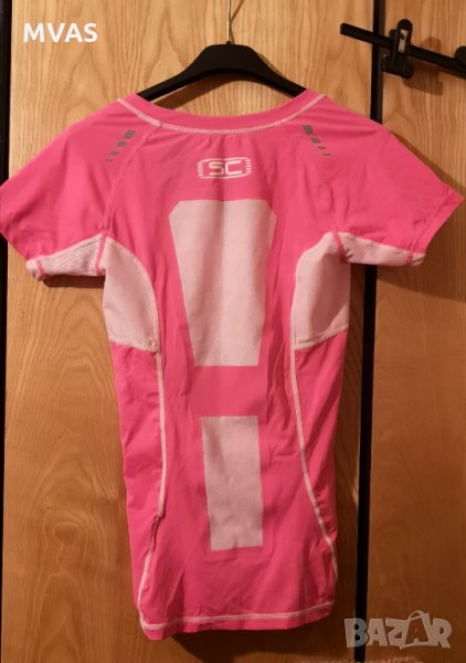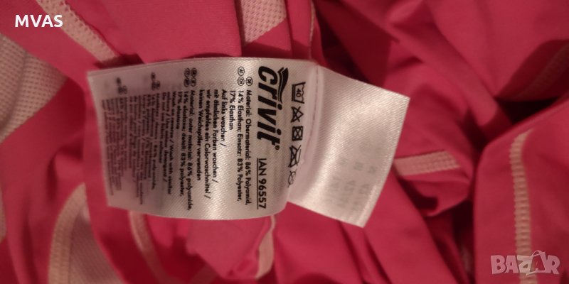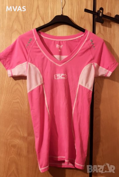 Розова тениска от бързосъхнеща материя с бели мрежички за проветрение,подходяща за колоездене и други спортове. Размер М пише, но по-скоро отговаря на S. Crivit марка