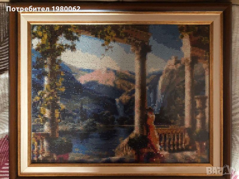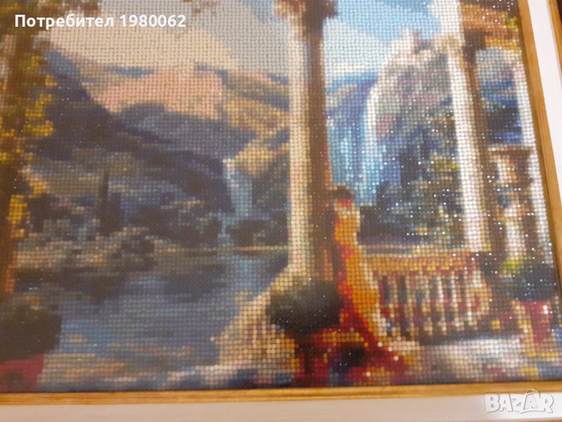 Пейзаж е диамантен.Изработен от кръгли диаманти,с подходяща рамка с размери 44/36см.и антирефлексно стъкло.Не е поставян на стена ,за украса!Тел.0896860467 Разгледайте и другите ми обяви,за гоблени!Всички са красиви и прицизно изработени!