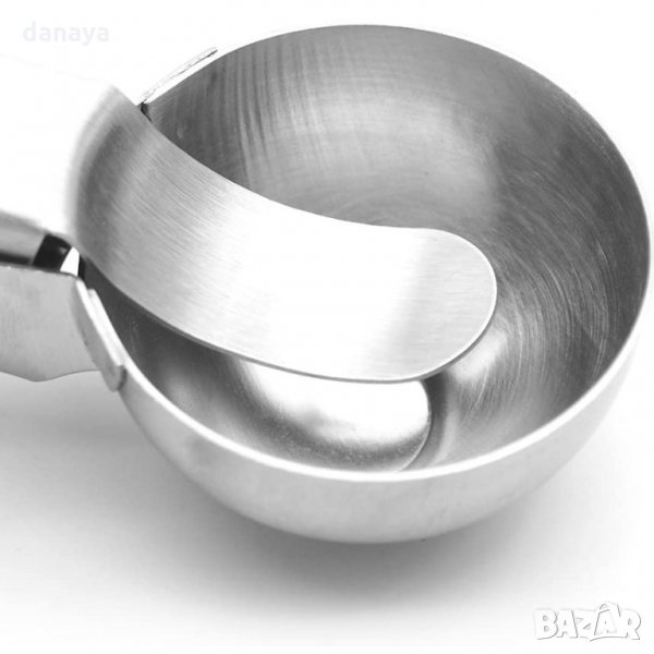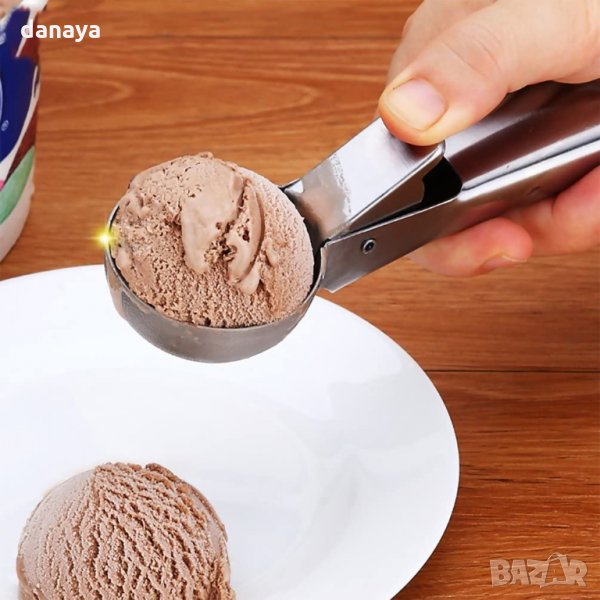 Метална лъжица за сладолед с механизъм, подходяща за оформяне на салати и предястия. Домакински прибор, изработен с механизъм за дозиране на топки сладолед. Идеален инструмент за оформяне на красиви мелби, салати, предястия.