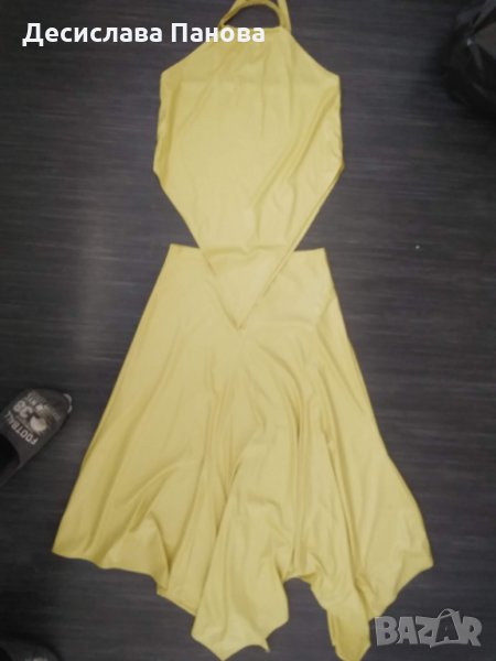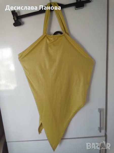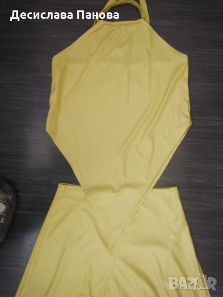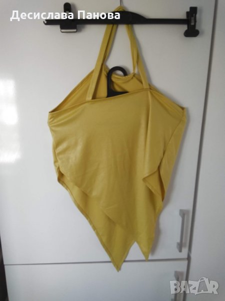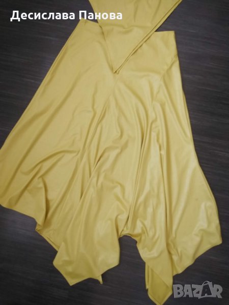 Много стилно, лятно костюмче в бледожълт цвят. Състои се от потниче и дълга ефирна пола. Материята е лека, еластична и нежна. Размери на потничето: гръдна обиколка-88-96 см, дължина-23 см. Размери на полата: талия-80 см, ханш-до 120 см, дължина на късата страна-60 см, дъ;жина на дългата страна-98 см.