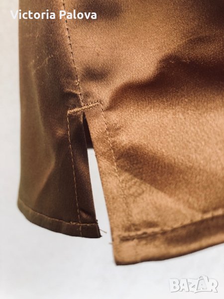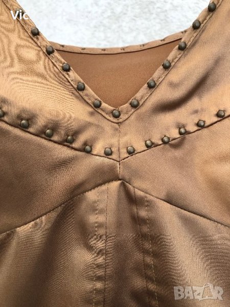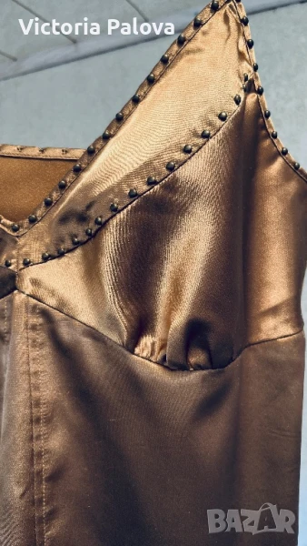 Прекрасен цвят, атлаз, разтеглив. 33см е дълъг без презрамки, с тях - 56см ,гръдната обиколка е 43-44см, странични цепки - 5см. Потникът е за М и за малък L. За момичета с по-голям бюст е находка, защото моделът е разкошен.