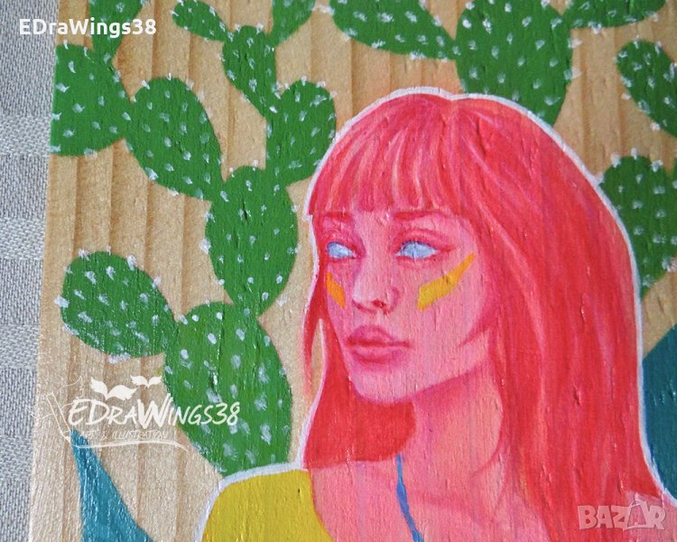 Ръчно рисувана авторска илюстрация - акрилни бои върху дървена дъсчица, с нанесен защитен лак, предпазващ цветовете. На гърба има корда и може да се окачва на стена. Оригинален подарък за любители на изкуството и на кактуси и други растения :)