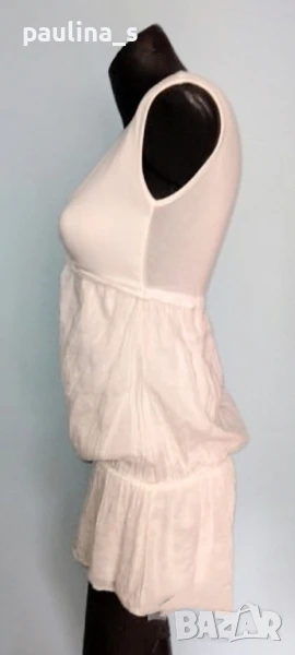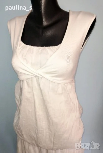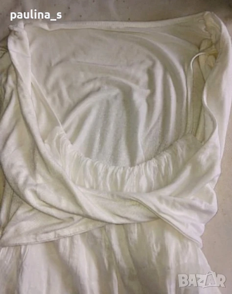 3️⃣. Колаж / L / 2XL - Двупластова италианска туника / пясъчна коприна. Цената е крайна 39,99лв. Бяла двупластова италианска туника, нова е без дефекти и етикет, една бройка. Долният пласт е от памучно трико с ликра-много еластичен и покрива няколко размера. Горният пласт е от фина пясъчна коприна. Моделът е много специален с набори и прекръстосано деколте бюстие отпред.