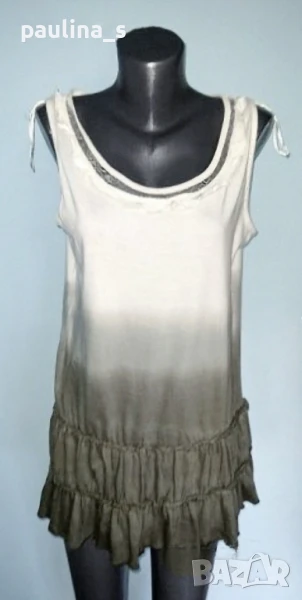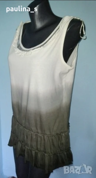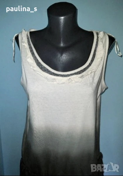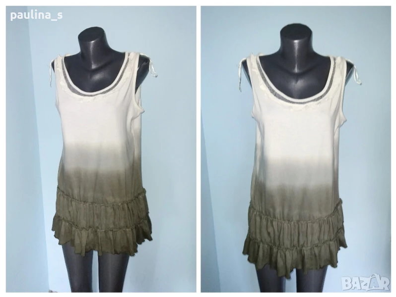 2️⃣. Колаж / "Okay" by S'Oliver. Цената е крайна 34,99лв. Преливаща се брандова туника от еластично трико - памук и ликра. Подходяща е за алергични и чувствителни към изкуствените материи кожи. Моделът е без ръкави с декорирано деколте. Цветовете се преливат до тъмносиво надолу. Втален силует, завършващ долу с ластични волани. Дрехата е изключително красива. Нова, без дефекти и етикет, става за посочените размери, една бройка.