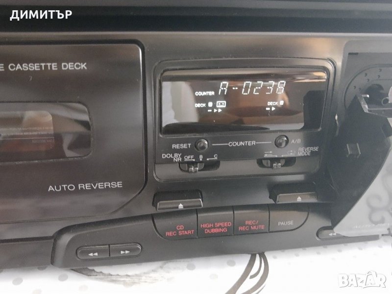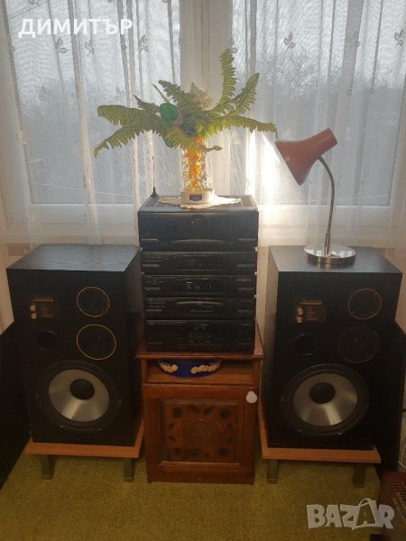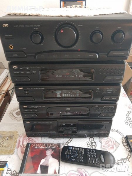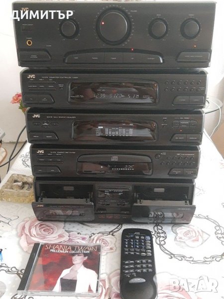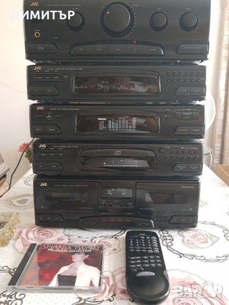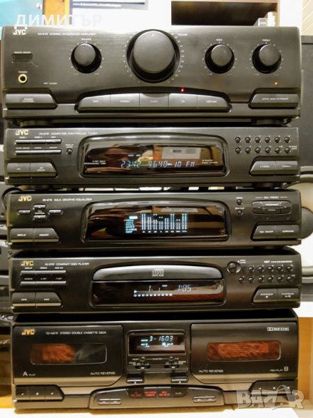 Здравейте. Предлагам на вашето внимание пет етажна техника на Jvc с отделни компонети. Истинска класика от 93г. Две по 50W на 8 ома. Чувствителност на входа за грамофон 3mV(MM),300mV(линия).Двукасетъчен дек с аутореверс,СД,тунер,усилвател,еквалайзер. Моторизирано усилване и намаляне. Оригинално дистанционно управление с пълно логическо управление. Без тонколоните. Позлатен вход за слушалки. Видът и е все още като в магазина. За първи път сервизирана и подменени с нови ремъци двете гнезда на дековете на 19.11.2020 г.