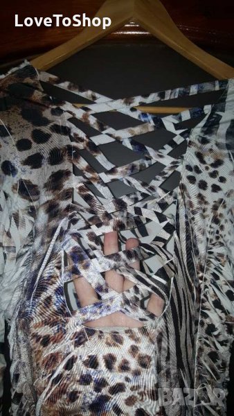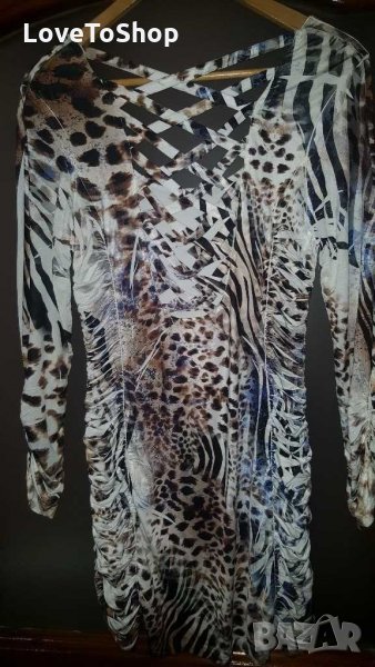 S 12 twelve дамска оригинална рокля, размер М, made in USA, 94% полиестер, 6% спандекс, с гол гръб, с животински принт, подплатена отпред и отзад; дължина ок. 85 см