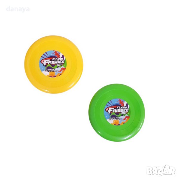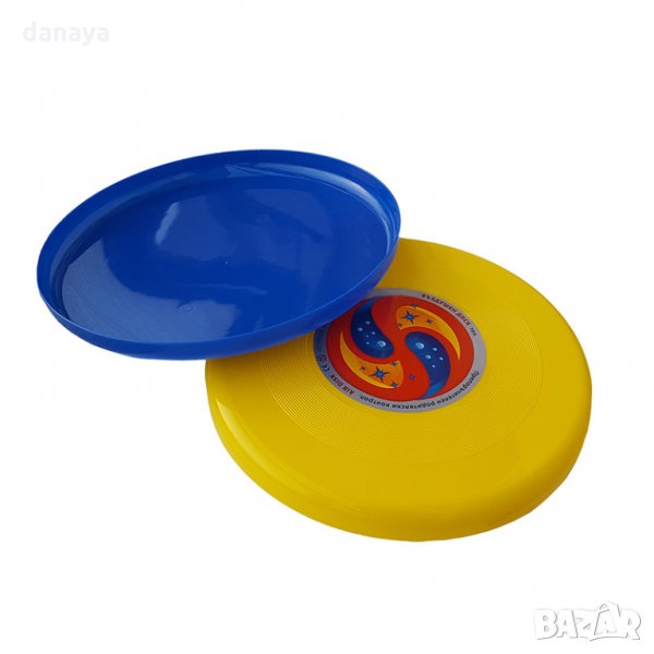 Фризби за игра навън. Летяща чиния, забавление на двора, на плажа, или на друго открито място. Изработено от пластмаса, предлага се в различни цветове.
