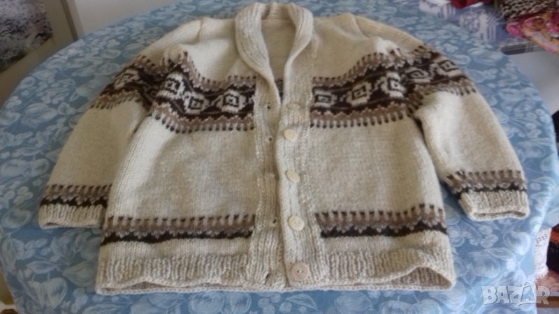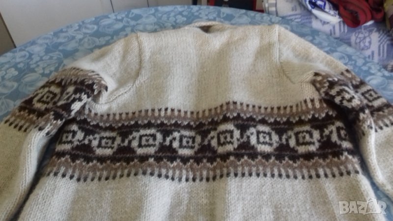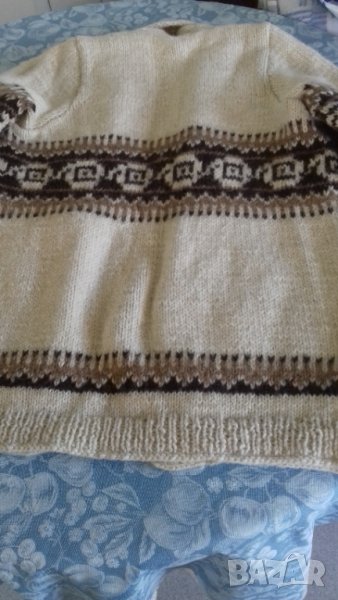 Много красива, тип шотландска , ръчно плетена жилетка с бордюри около раменете , в долния край и по края на ръкавите. От естествена вълна и с основен цвят на вълна в приятно съчетание с кафяво и бежево. Малко е носена, няма следи от носенето. Според мен тя е размер 42.