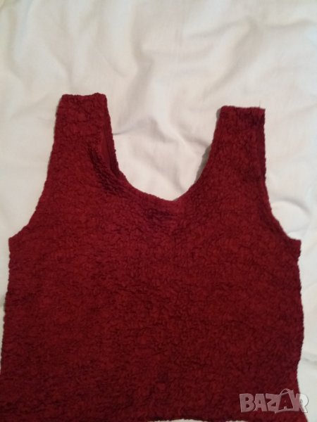 Дамски къс потник от намачкан еластичен плат, по тъмно червен цвят.Бюст 38 см, дължина 42 см. Отговарям на съобщения тук, изпращам с куриер или лично предаване в София.