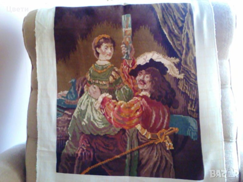 Ръчно и качествено ушит гоблен в рамка „ Автопортрет на Рембранд със Саския “ с унгарски конци пъпетс.Размери 45,5 - 37,5 см.