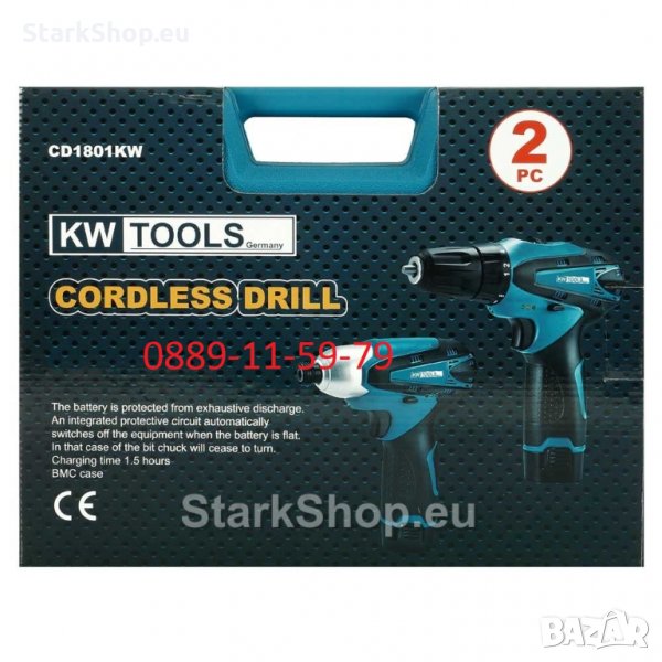 Професионален комплект KW-TOOLS от акумулаторна бормашина и ударен винтоверт. Комплектът съдържа две машини. Едната разполага с 10мм. патронник, а другата с шестостен.