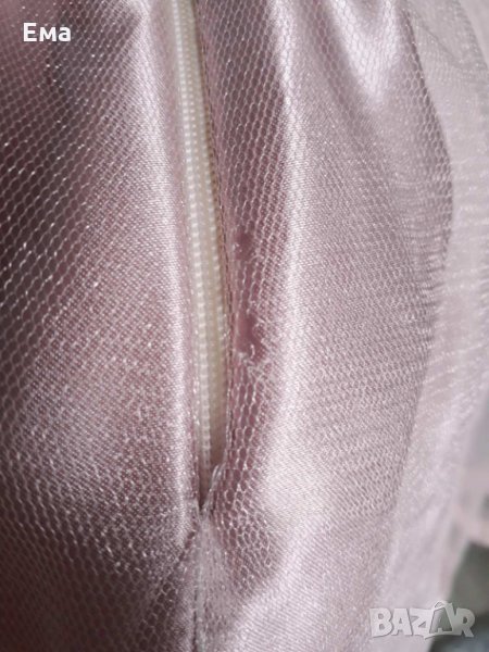 Стои много елегантно и е много красива, но има забележка, която се вижда на последните две снимки (тюла е захванат с ципа на две места, които обаче не се забелязват от панделката отзад и от самата гънка на роклята, но аз съм ги опънала, така че да се виждат). Не знам дали не може да се смени тюла при шивач?!