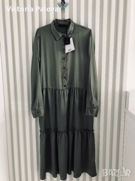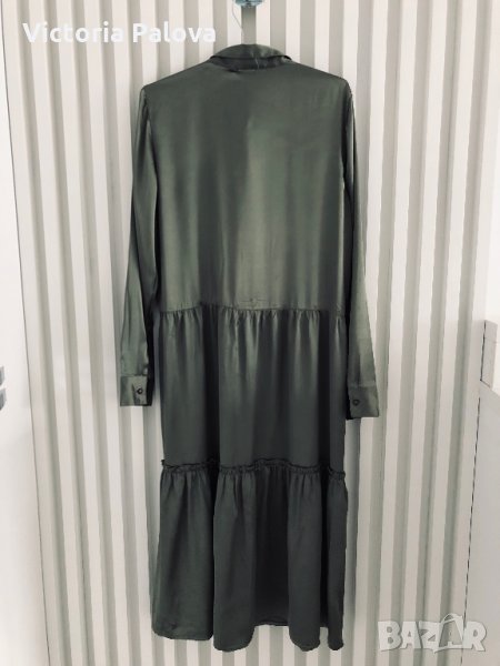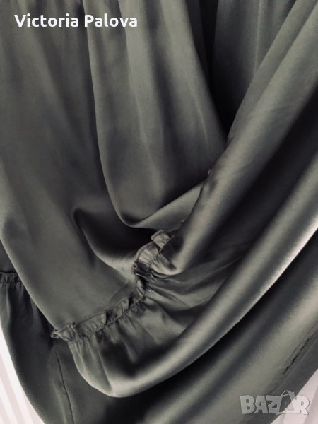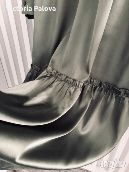 Нова красива рокля ,”студена” материя,гладка,изглежда като преливаща се коприна.актуален цвят и кройка.раменете са 42см,гръдна обиколка-51-52см,дължината е 120-121см.
