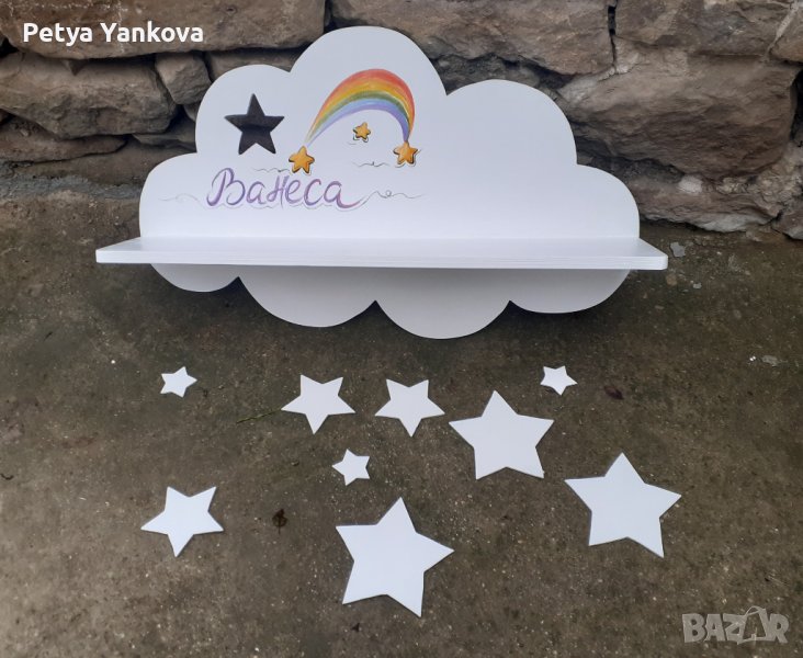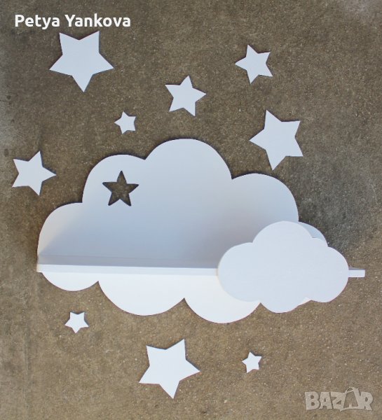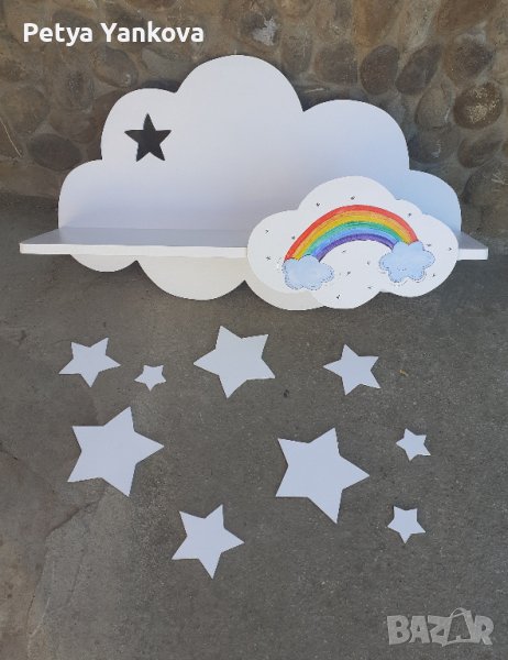 етажерка облак със звезди, плюс допълнителни 9 бр. звезди. Дължина на етажерката до 70 см., време за изработка около 10 дни. Цвят по желание