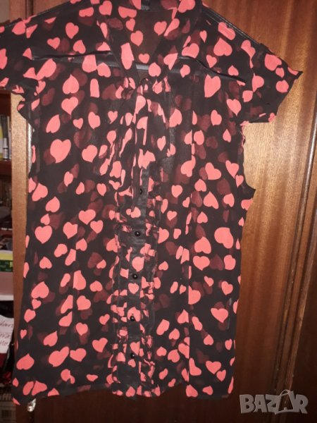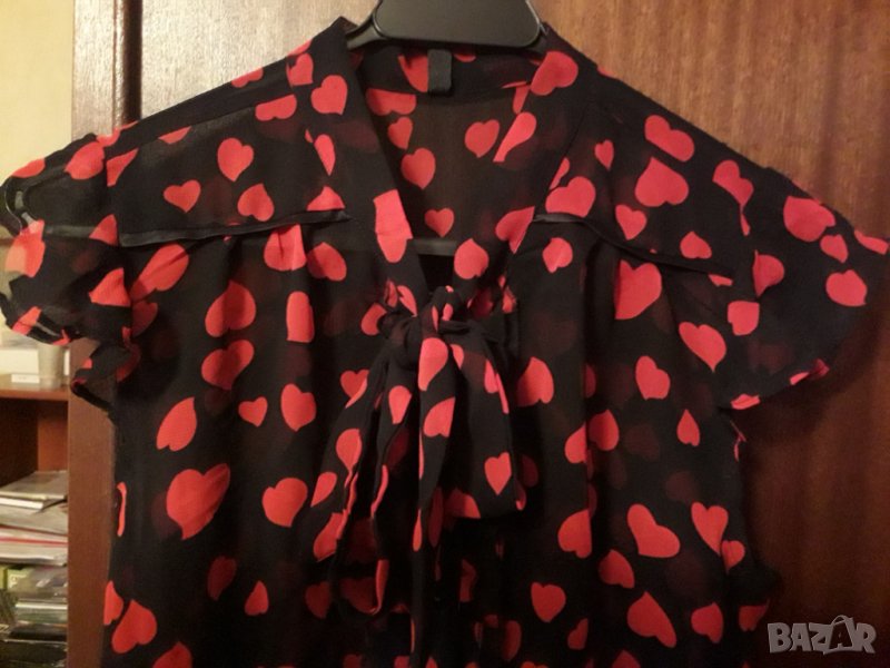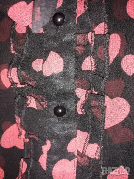 Дамска лятна ефирна блуза риза с къс полуръкав като камбанка, с копчета и пандела, черна полупрозрачна материя с розови сърчица, размер среден М. Бюста е 46 см измерено отпред /или обиколка 92 см/, талия 44 см /или 88 см обиколка и надолу се разширява към ханша около 50 см /или 100 см/. Отговарям на съобщения тук, изпращам с куриер с отстъпка, преглед и тест, или лично предаване в София.