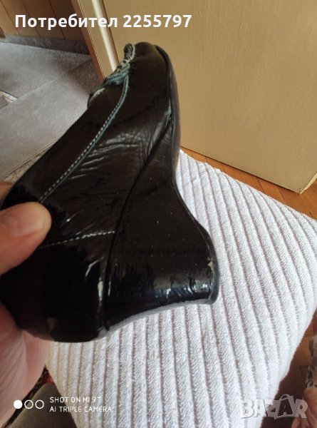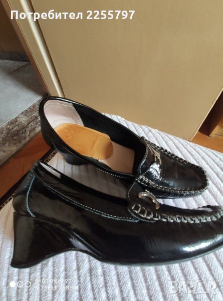 Черни лачени мокасини номер 36 ,но отговарят на номер 37. Много меки, леки и удобни като пантофки. Височина на тока 5 см. На левия ток има много малка забележка която съм снимала. Доставка с опция преглед и тест.