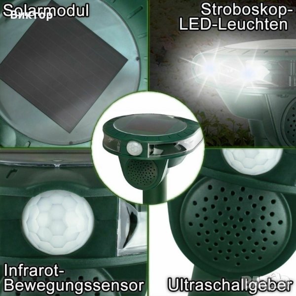 Многофункционално плашене за животни: ултразвукова защита + защита от стробоскоп + слънчево зареждане + детектор за движение + сензор за здрач