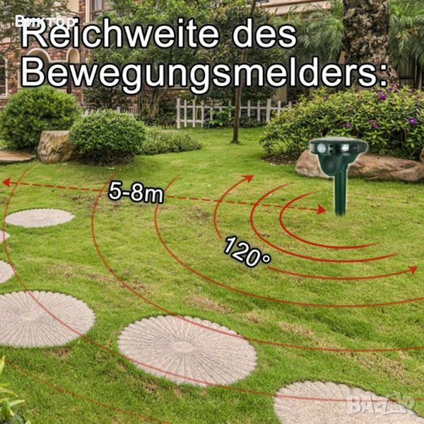 Инфрачервен детектор на движение: PIR сензорът реагира на топлината на тялото дори при пълна тъмнина, с обхват от 5-8 м в зона на откриване от 120 ° (това съответства на площ от около 40 м²). Веднага след като животно или птица пресече областта на инфрачервения сензор, се излъчват акустични ултразвукови вълни и в тъмното се активират LED стробоскопични светлини. Това дава възможност специално да се защитят определени зони от имота или обекти.