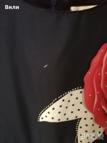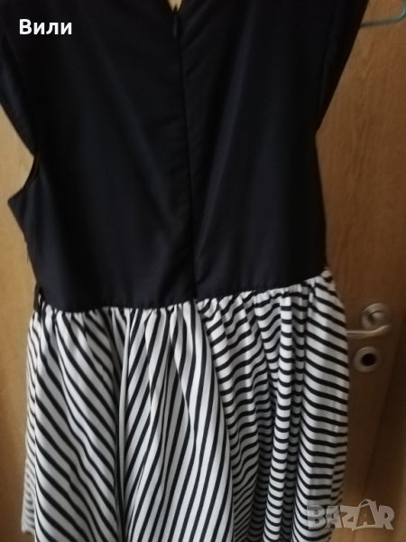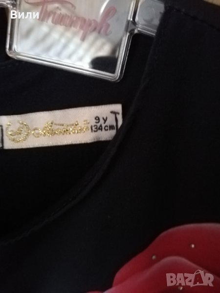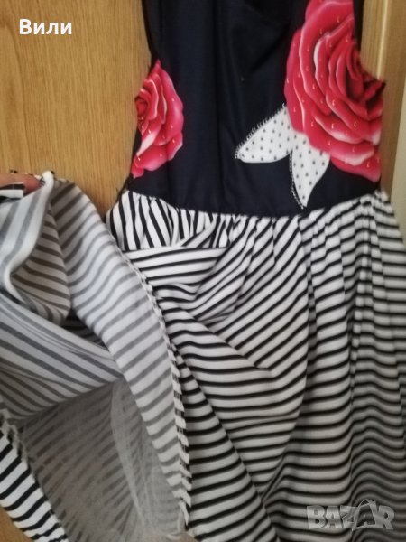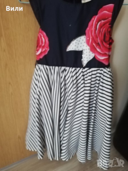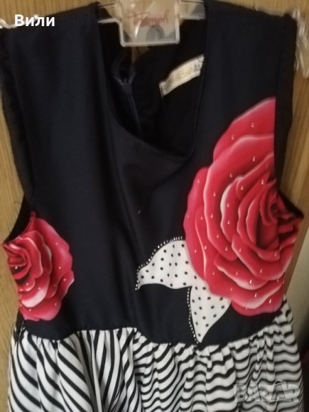 Прекрасна въртяща се рокличка с чанта в тон за малка дама. Обличана е 3 пъти по повод. Има едно бяло петъце, но това си е от плата и при носене не се вижда. Така е закупена.