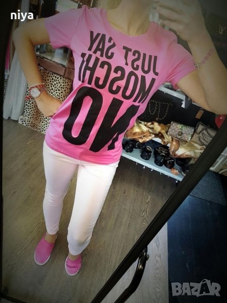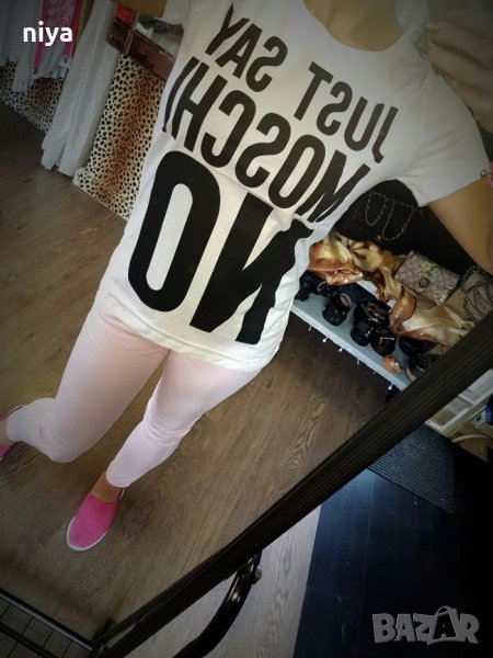 Дамска тениска Just Say Moschino Print във розов и мръсно бял цвят → Обява 28868391