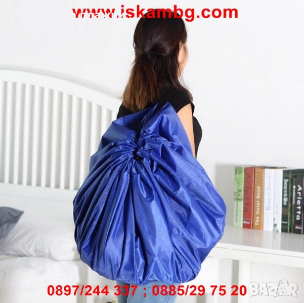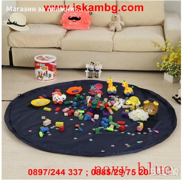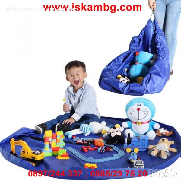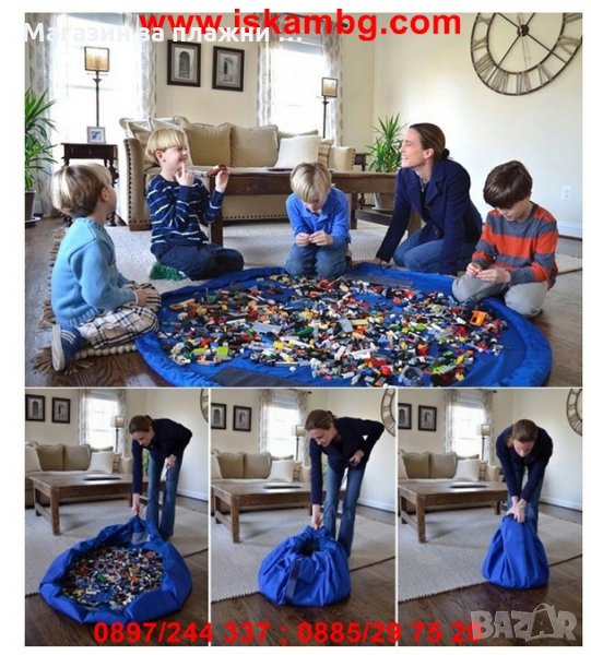 Преносима детска чанта органайзер за играчки Лего или други дребни играчки. Практично детско килимче за игра, с което лесно ще съберете всички разпилени играчки наведнъж. Килимчето е особено подходящо за играчки от типа конструктор Lego, пъзели. С тази преносима постелка за игра осигурявате забавна и весела игра на децата, без да се притеснявате, че после ще събирате парченцата поне час от пода. След като играта приключи, просто съберете килимчето и то ще се превърне в торба-раница, която може да се съхрани в гардероб или на друго място.
