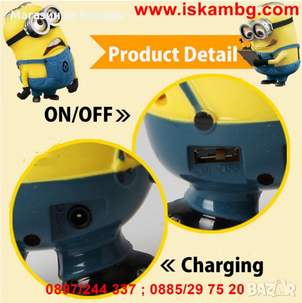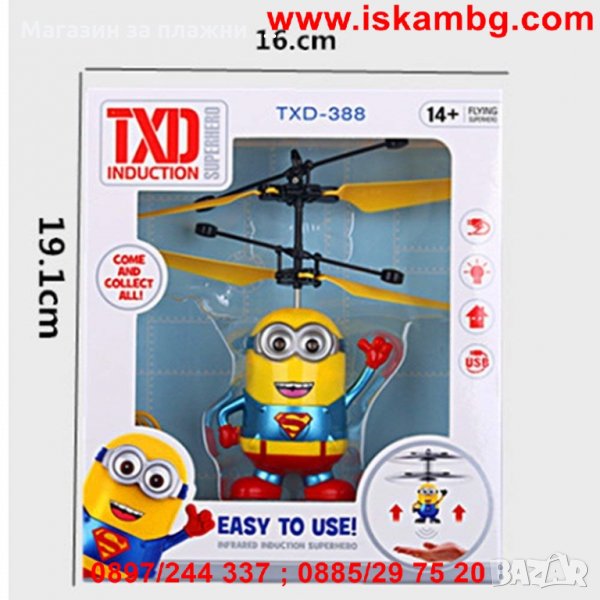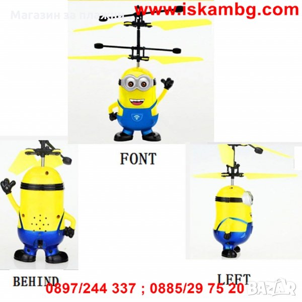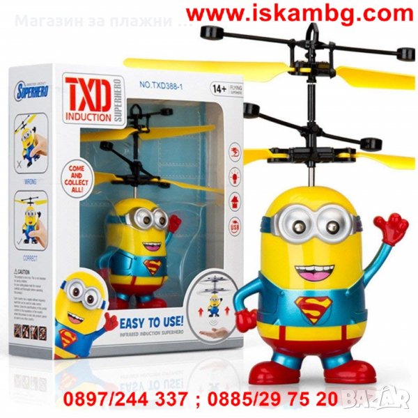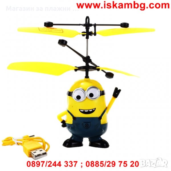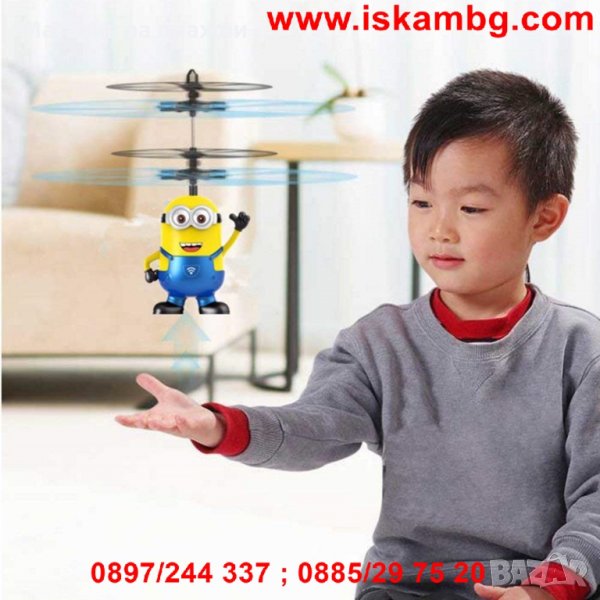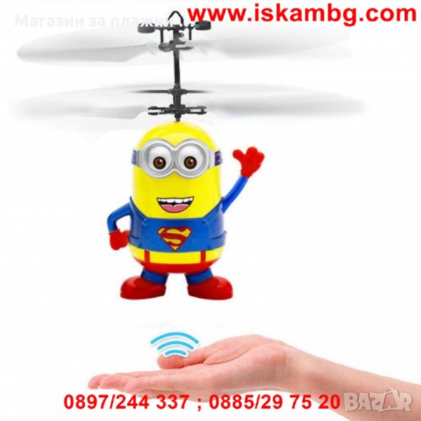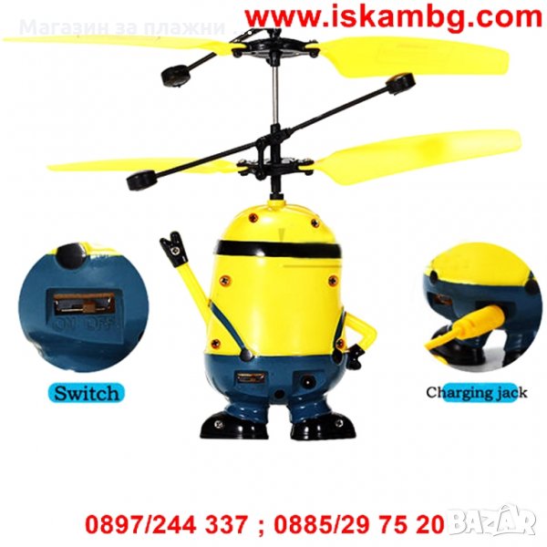 За да се насладите на полета му е нужно само да го заредите, като го свържете с USB кабела (включен в комплекта) към компютъра. След като е зареден - включете копчето и той ще полети. Отдолу на крачето има сензор и можете да управлявате полета му с дланта си! Любимите на всички деца сега летят и се управляват с ръка. Забавата на цялото семейство е гарантирана! Характеристики: - Сензор за контрол на полета - Функции нагоре и надолу - Време за летене: до 8 минути - Време за зареждане: 25 минути Зарежда се от USB на компютър. Размери: 14 х 4,5 х 13,5см Комплекта включва: 1. Летящ миньон 2. USB кабел