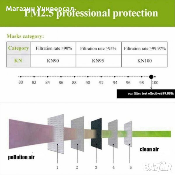 – Филтър N95 е 5 слоен и предпазава от всички частици във въздуха.- филтри за твърди частици може да помогне за филтрация на газ от токсични, бои, дим, прах, мъгла, изгорели газове и др.