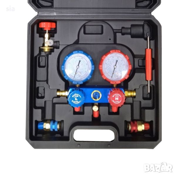 фреон R12, R22, R134A, R410A, R404A.Двойният манометричен блок e прецизен уред за измерване на високо и ниско налягане във хладилни и климатични инсталации.Корпус от алиминиева сплав.Удобен за употреба, с кранове и кука за закачане.Високо налягане: 0-800psi (0 до 55 бара).Ниско налягане: 0-500psi (-1 до 35 бара). Измерван вакуум 0-30 In/HgКомплекта включва:Колектор с маркучи и бързи връзки за смяна на хладилен агент.Манометричен блок двоен за климатици, на регулируем разклонител.3 броя 140см цветни маркучи с накрайници.Спирателни вентили за високо и ниско налягане.Индикатори за налягане за диагностика без сервизни устройства.