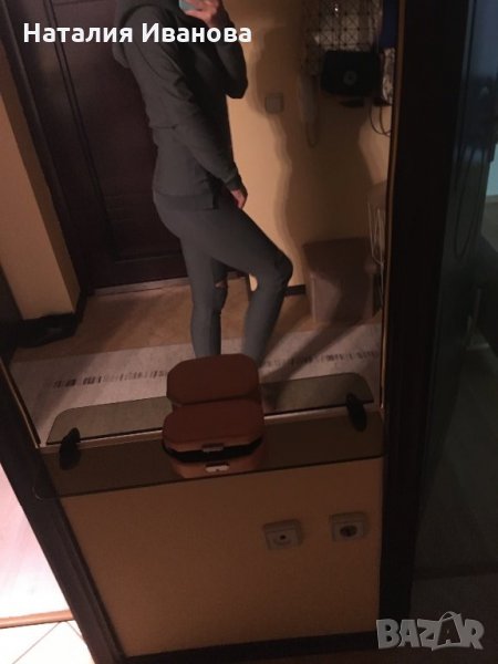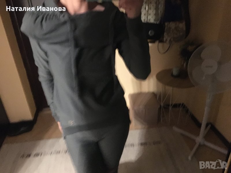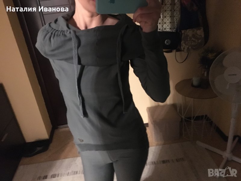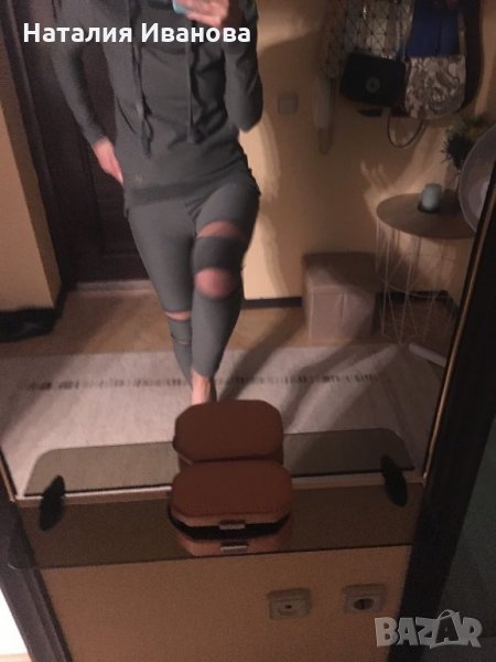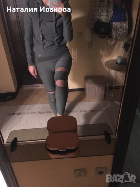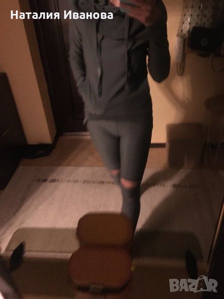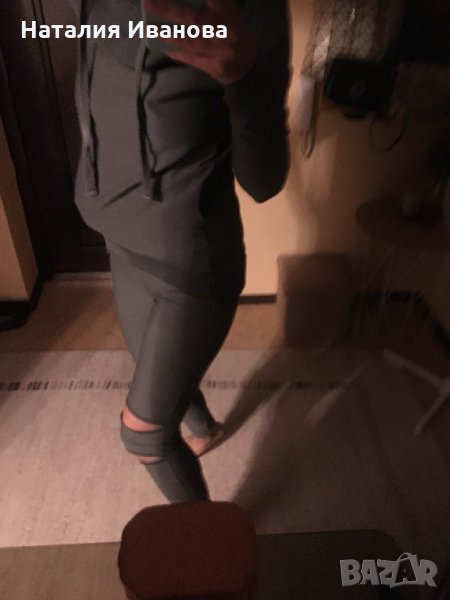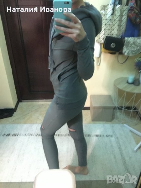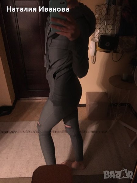 Продавам дамски еластичен комплект в сив цвят . Клинът е с интересен детайл на коленете. Горнището има два джоба и интересна яка / качулка. Не се разменя за друга стока.
