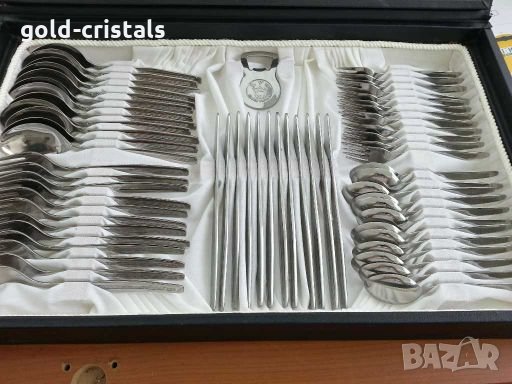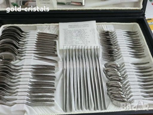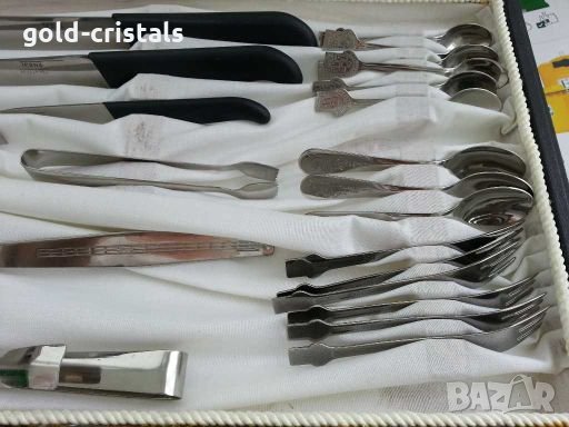 Терна неръждаеми маркирави на два етажа в кожен куфар опис на приборите на снимките ножове вилици лъжици чаени лъжички десертни вилички кафени лъжички малки вилички лъжица за сервиране вилица за сервиране щипка за сервиране щипка за захор щипка за лед отварачка кухненски ножове 3бр.сервиз комплект сет лот ретро арт декор винтидж колекция стари старинни антикварни предмети обзавеждане за дома и семейството подходящи за подарък за ценители и колекционери