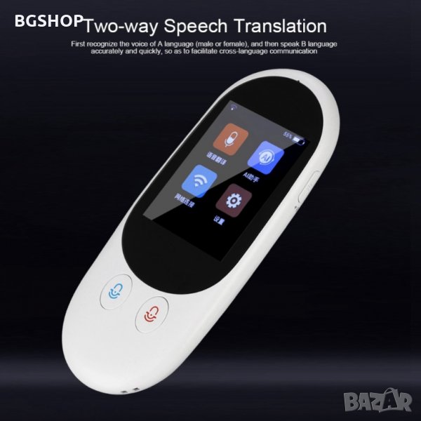 Как работи: Имате два бутона,образно наречени бутон A и B. Когато искате да кажете нещо на човека пред вас, натиснете бутона A и произнесете изречението си навашият избран език. След като освободите бутона, той превежда гласово изречението на вашия събеседник и езика ,който сте избрали.Когато искат да ви отговорят, задръжте бутона B, докато говорят.Тяхното изречение ще се изговори обратно на вашия собствен език! Хубавото също така е,че превода се изписва на екрана и на 2-та езика може лесно да учите как се изписват думите!Времето на запис е до 60 секунди може спокойно да изговаряте няколко изречения. Друга удобна функция е камерата с която може да заснемате директно надпис и ще бъде преведен на желаният от вас език!