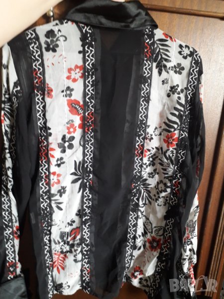 Дамска официална риза с дълъг ръкав, полупрозрачна материя, цвят черно, бяло и червено, с яка и маншети на ръкавите от черен сатен. Размер № 46-48 българска номерация, може и за 50 в зависимост от фигурата. Рамене 40 см, бюст 46 см отпред /или 92 см обиколка/, талия 44 см /или 88 см обиколка/, дължина на ризата 60 см, ръкав 60 см. Ризата е нова, съхранявана в опаковка. Отговарям на съобщения тук, изпращам с куриер с отстъпка и преглед и тест, или лично предаване в София.