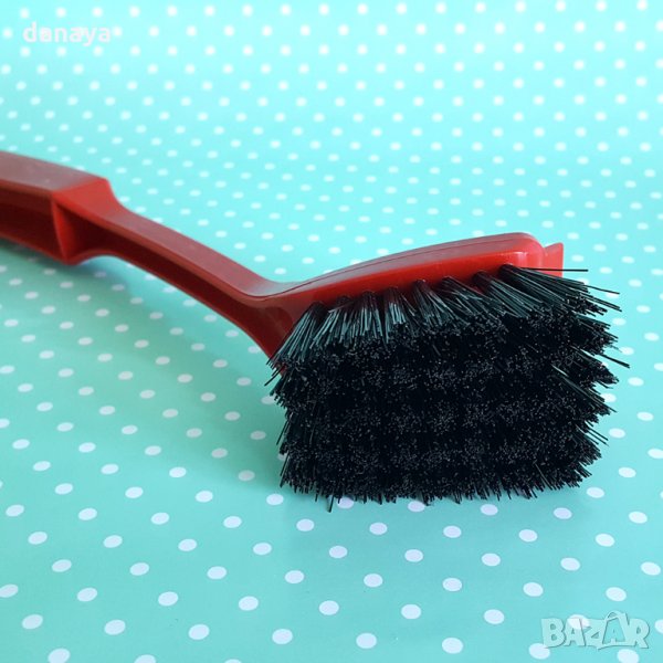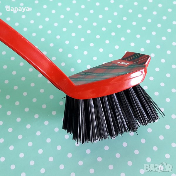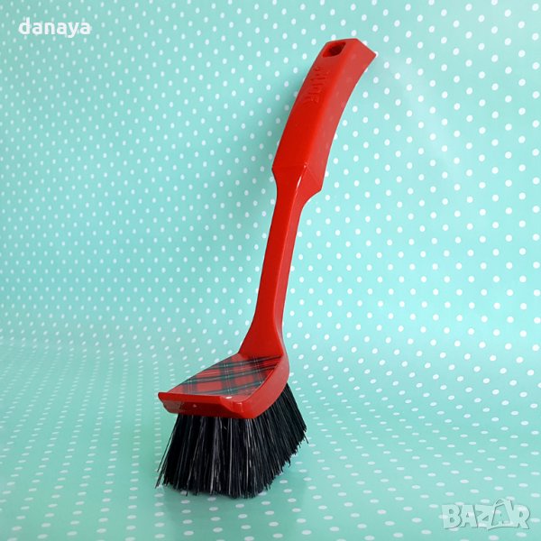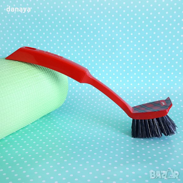 Четка за миене на съдове с дълга дръжка. С плътни косъмчета с подходяща твърдина и стъргалка в предната си част за отстраняване на упорити замърсявания. Дългата дръжка я прави удобна и увеличава комфорта на работа. Четката е подходяща и за почистване на плоски повърхности като плочки и кухненска мивка. Изработена от материали, устойчиви на битови химикали и топла вода. В дръжката си има дупка, с която можете да окачите четката на кука за лесно съхранение. Дизайнът естетически се вписва в интериора на много кухни.