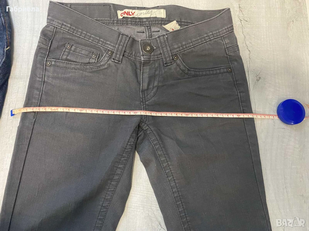 Сивите дънки са нови, сините са носени, имат еластичност. Дължина измерена от колана 99см, талия измерена в закопчано състояние в едната посока 37см. Цената е обща, може продажба и отделно.