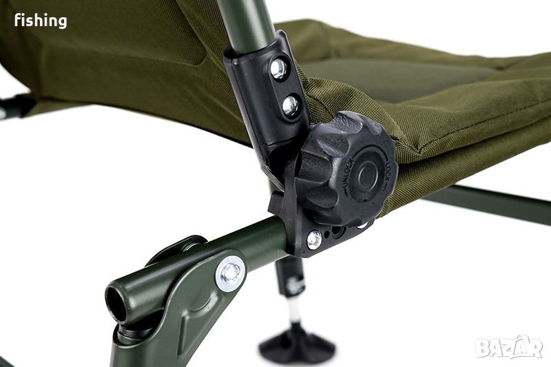 Изключително лек и много удобен сгъваем стол с дебела тапицирана седалка, облегалка и табла. Той има много лека и здрава метална конструкция, изработена от алуминий и стомана и всичките четири регулируеми крака с широки крачета срещу попадане в мека земя. Сглобява се в много малки размери. Страхотен избор за риболовци, които обичат метода на техниката на фидер или други начини на риболов на фидер и се нуждаят от по-лек, по-удобен и опростен стол.