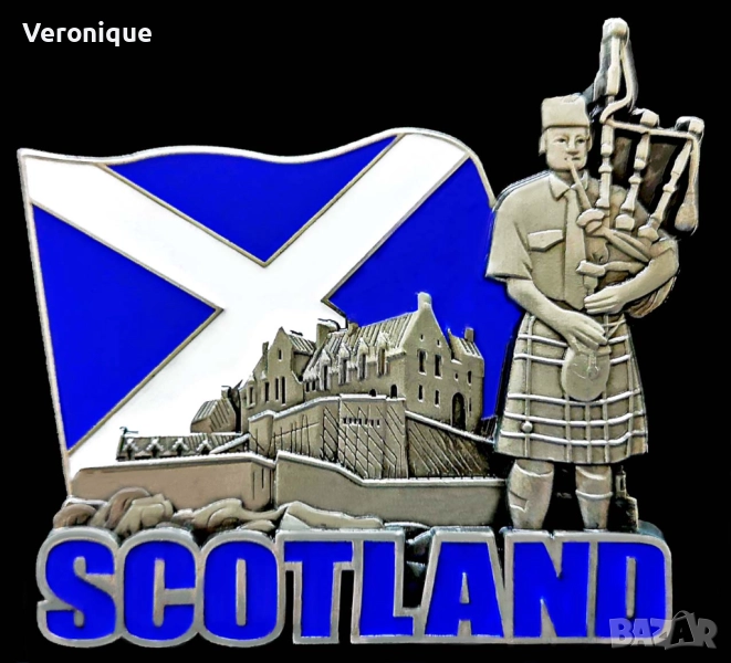 2. Магнит Шотландия / Замъкът в Единбург с шотландски гайдар в традиционно нац.облекло; 8.3 х 7.2 cm – 12 лв