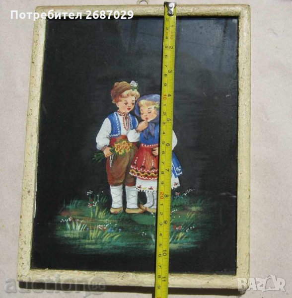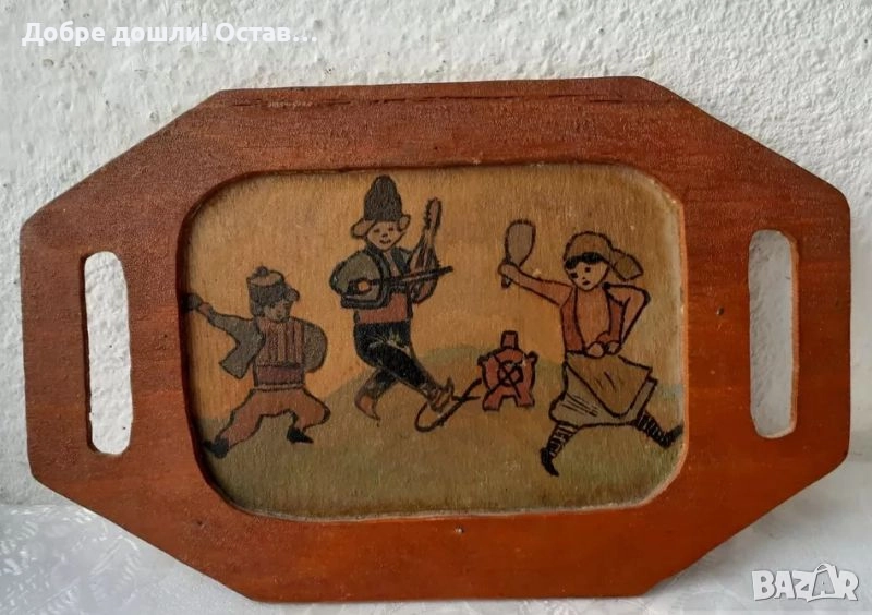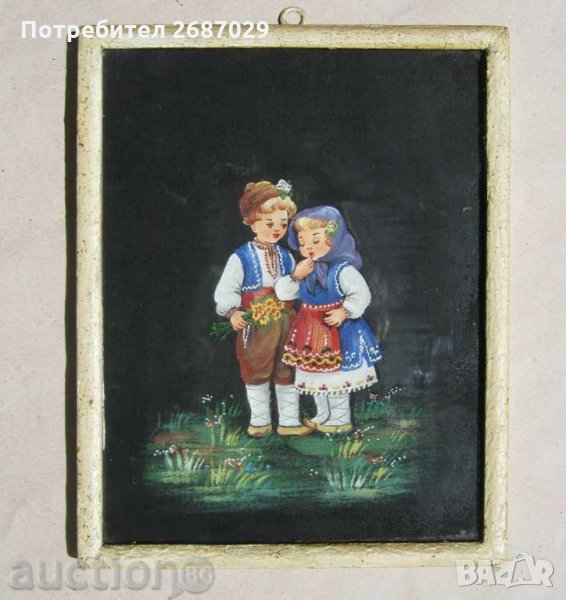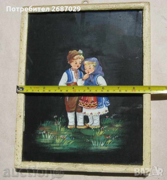 Картини:1973 картина деца с национални носии с рамка, танц, наивна картина и дървен поднос ръченица → Обява 28949736