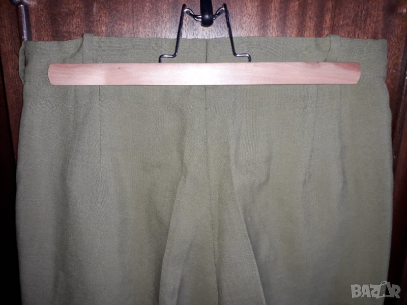 Дамски летен панталон, по-широки крачоли и с басти в талията и странични джобове, цвят зелен тютюнево резида. Размер М, около № 40-42 бълг. номерация, талия отпред 38 /или обиколка 76 см/, ханш 52-54 /около 104-108 см/, дължина 100 см. Отговарям на съобщения тук, изпращам с куриер с отстъпка, преглед и тест, или лично предаване в София.