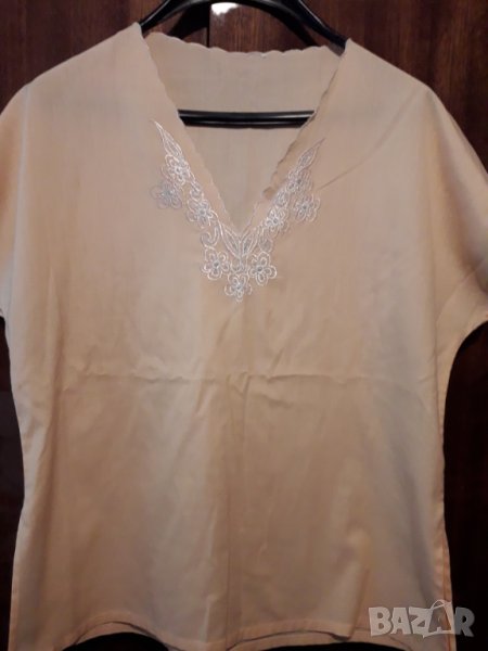 Дамска лятна блуза без ръкав с остро деколте и сребристо бяла бродерия, цвят праскова, свободно падащ къс ръкав, отстрани с 2 цепки. Размер М-Л, бюст 50 см отпред или обиколка 100 см, дължина 59 см. Блузката е нова, само е пробвана, но не ми става. Отговарям на съобщения тук, изпращам с куриер или лично предаване в София.