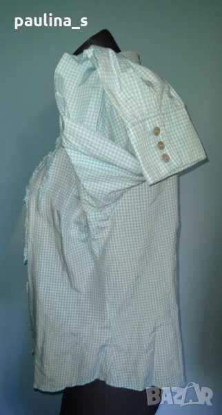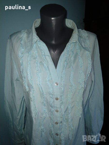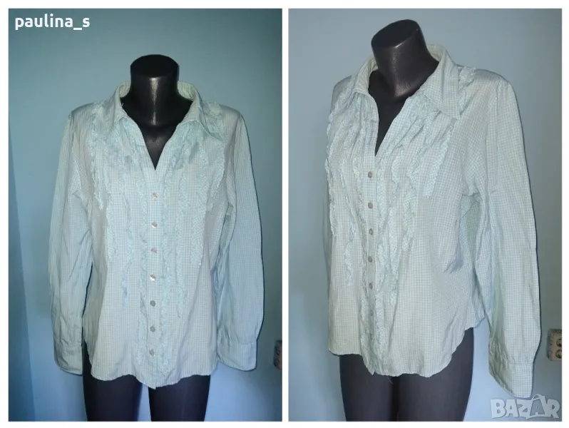 1️⃣. Колаж / L / 2XL - "Essentials". Цената е крайна 24,99лв / 12,4 евро. Брандова риза с къдри и жабо. Материята е 100% органичен памук - хипоалергична и приятна за допир с кожата, без еластичност. Деколтето е шпиц, декорациите са от къдри, по три копчета на ръкавите, втален силует, с извити предни и задни части. Десенът е сигнално синьо в каре. Уникална, като нова.