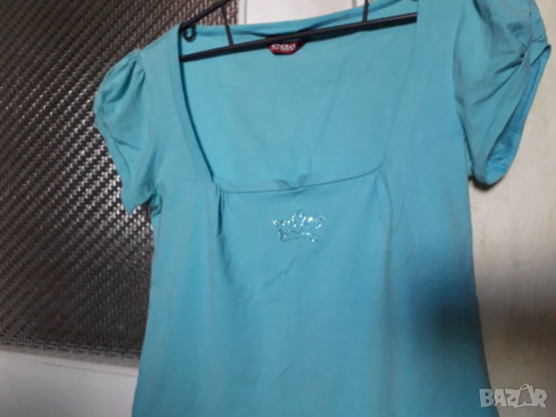 Дамска памучна блуза с къс ръкав, памук 95 % и 5 % еластан, цвят син, с апликация от малки камъчета отпред, ръкавчето е късо и леко набрано по средата. Размер М. Отговарям на съобщения тук, изпращам с куриер с отстъпка преглед и тест, или лично предаване в София.