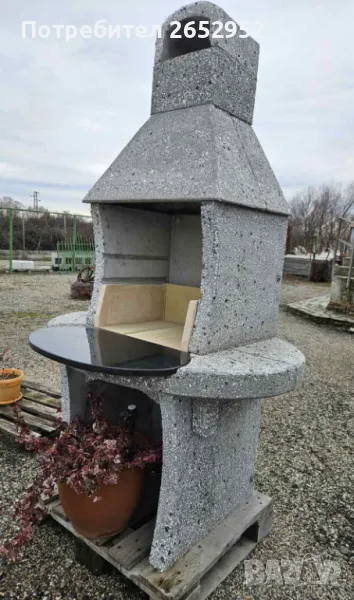 Изработено от бял и черен трошен камък, плотът е от гранит, а горивната камера с шамот и огнеупорни плочи.