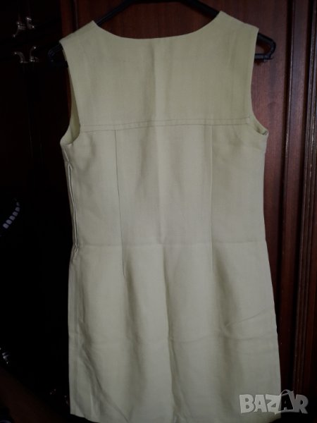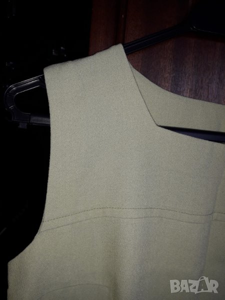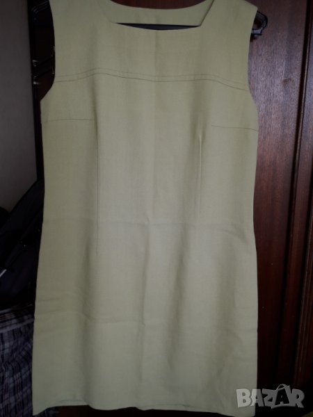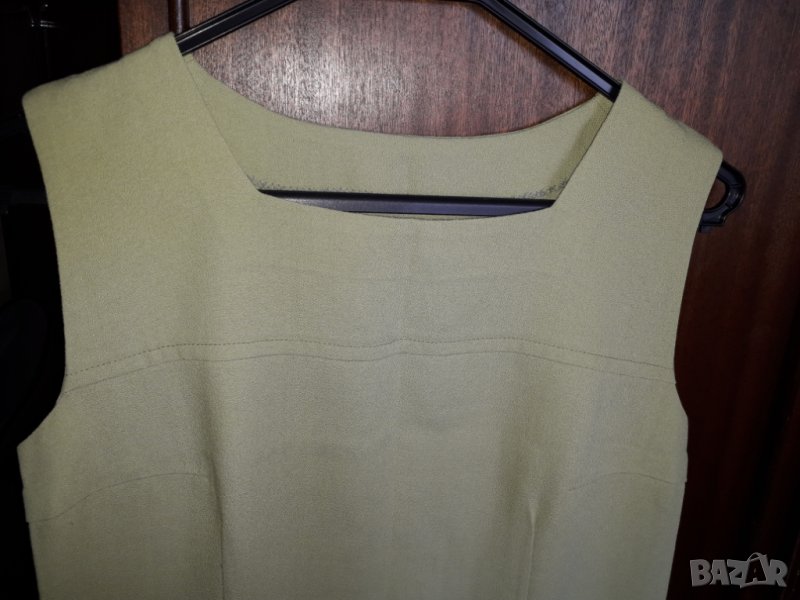 Дамска рокля без ръкав средна дължина, леко вталена, цвят резидаво зелено, прекрасна материя и много добре стои по тялото, размер М бюст 44-46 см отпред измерено, талия 42-44 см, ханш 50 см, дължина на роклята 84 см. Имам и жилетка от дантела към нея в обявите ми с бие от същия плат, отделно се продава - 20 лв. по желание. Отговарям на съобщения тук, изпращам с куриер с отстъпка, преглед и тест, или лично предаване в София.