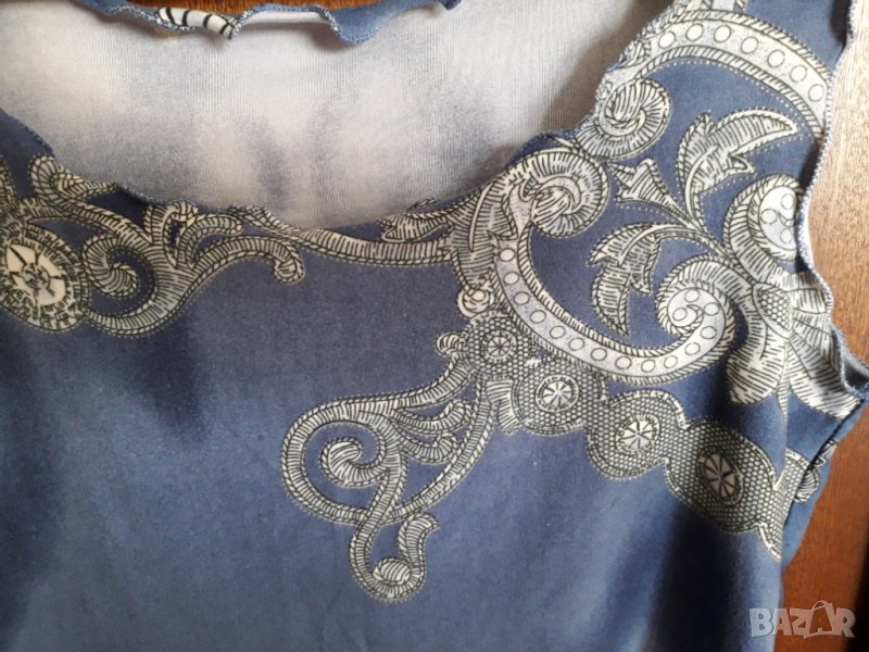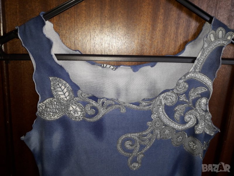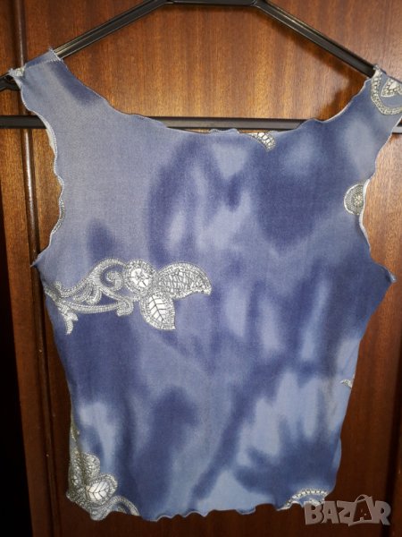 Дамска блуза потник по-къс, с леки къдрички по краищата. Еластична материя, цвят синьо и сиво. Размер около 36-38 до 40 български, потникът е нов. Отговарям на съобщения тук, изпращам с куриер с отстъпка, преглед и тест, или лично предаване в София.