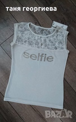 Прекрасна светло-бежова сатенирана блузка,с изрязяна платка от нежна дантела.Отпред с нежна декорация от финни камъчета и надпис.Има разтегливост