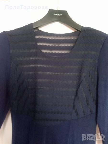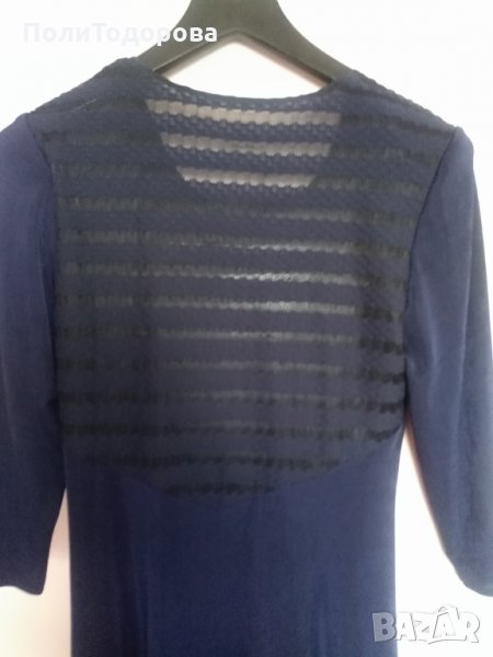 Дамска дълга рокля над глезена, размер M, тъмно синя с 7/8 ръкав. Дантелена Горна част, долна тежко падаща разкроено на 6 парчета.