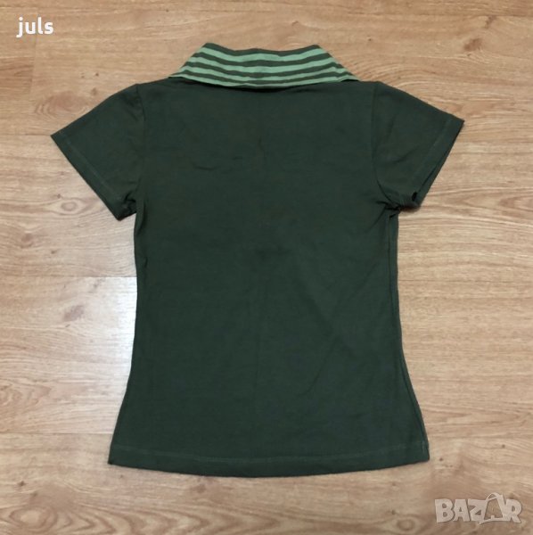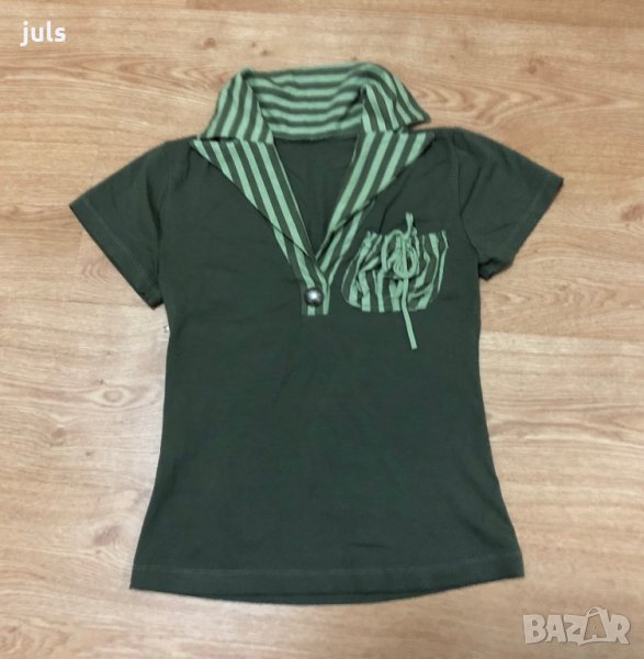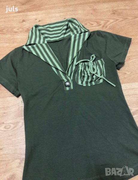 Елегантна зелена тениска с къс ръкав, с раирана яка и джобче. Размер М-L. Памук с еластан. Добра разтегливост, стегната материя. Втален модел. Нова, без етикет.